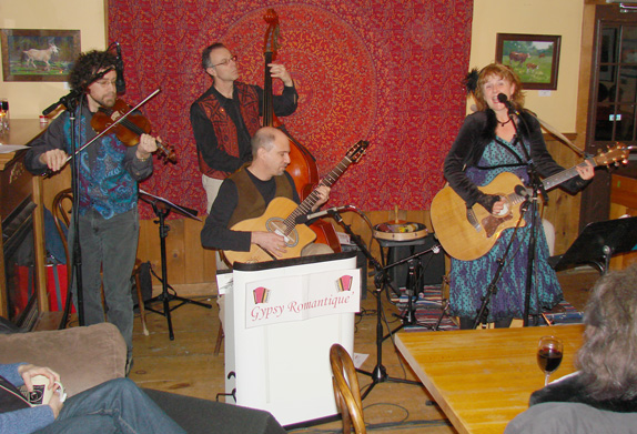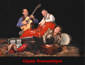Gypsy Romantique’, whose slogan is: a little Django, a little Tango, a little Swing, A LOT OF FUN!, is just all that. Whimsical and romantic with a lot of the humor infused in Dufresne’s lyrics, the band takes the audience on a magical tour through the jazz and swing era in a brightly wrapped package of new and original material.